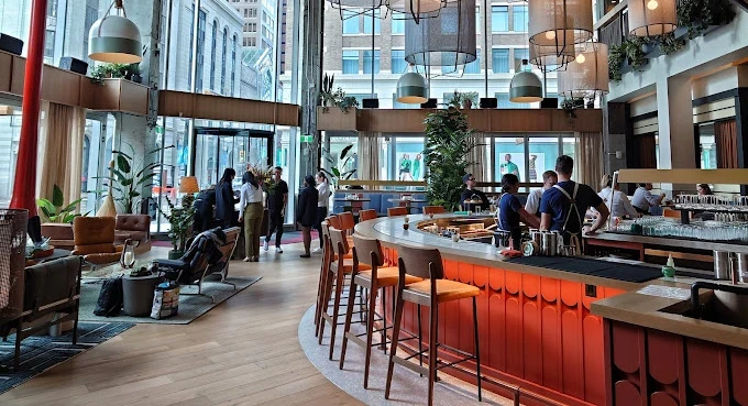 Bank-to-restaurant retrofit with mezzanine, feature bar & patio—preserving heritage in downtown Calgary.