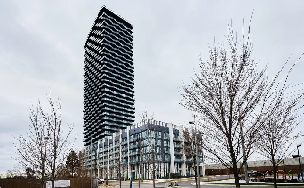 36-storey condo in Toronto with 459 units, rooftop pool, gym, green terrace, and on-site park.